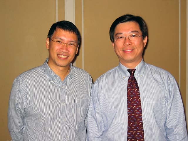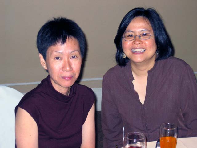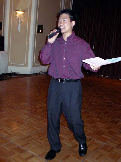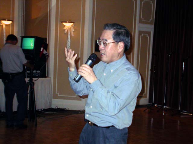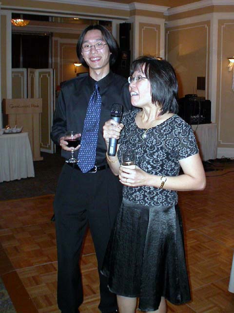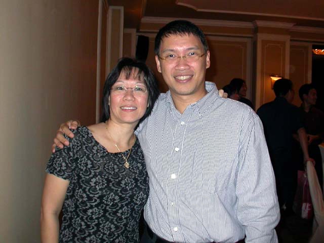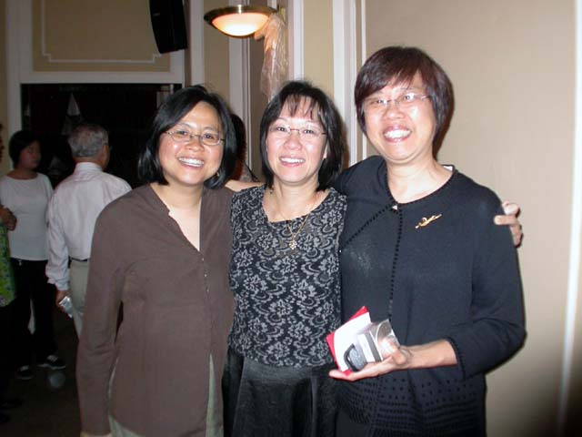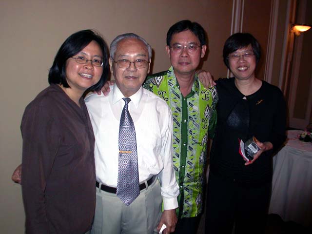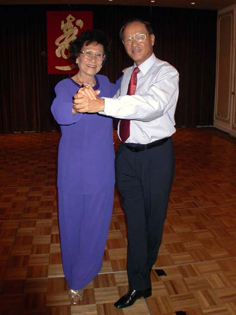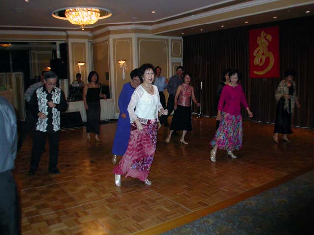 After an opening prayer by Ee Wen, Cheng came on as the most excellent MC and was once again trying to lure unsuspecting bachelors with her witty jokes so that they can sample her wares... :-) - haha...obviously worked on some. Ping also came up sometime during the middle of dinner as Kow Chek's "spin doctor", and introduced a host of singing angels. These angels were a different sort though, as they really knew how to "goreng" Kow Chek !! Lucky for us most of the "older" folks can't hear so well ... hehe ;-) Throughout the dinner, there was lots of ballroom dancing...led of course by the birthday boy and Kow Sum, and lots of singing too. I think this night was a real eye-opener for many of us as we really didn't know that they were so talented. At the end of the dinner, Donna Mae and Meng Jin gave a very nice slide show presentation. If she sends it to me, I'll see if I can put it up on this web for us all to admire !!