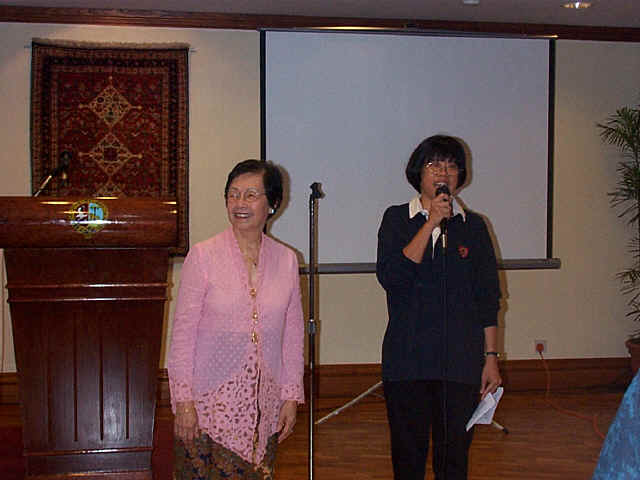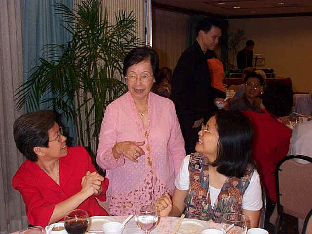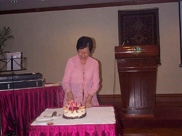 Links in this page : | It was held on Saturday, 1 May 99, at the Singapore Island Club, Bukit Location in a function room - hosted by Joe, Jane, Ed and Doris of course. The room was filled with about 8 tables of friends and relatives. A very cosy affair with many people coming up to the podium to do a skit (Joo Kim and Cheng did a Peranakan style of Bibi Kim and Bibi Cheng - trying to find the birthday party, and reminiscing about how Sah Kor potong jalaned George from them !), sing a song (Joe, Ee Wen, Ming Fern, Tuo Shen, Kow Chek, Lani, Ben Khoo), or to wish the "grand ole dame" (as Gor Pek puts it) a VERY HAPPY BIRTHDAY !! Some folks who were from overseas included Lani from Hong Kong, Goh Pek and Rupert from KL, Sylvia from JB, and Joo Ann from Austria. Thumbnails of pictures I took are below, and if you'd like to see a bigger version of a picture, then click on it. If you need more details about any of the pictures, write to me and I'll fill you in. Enjoy !!