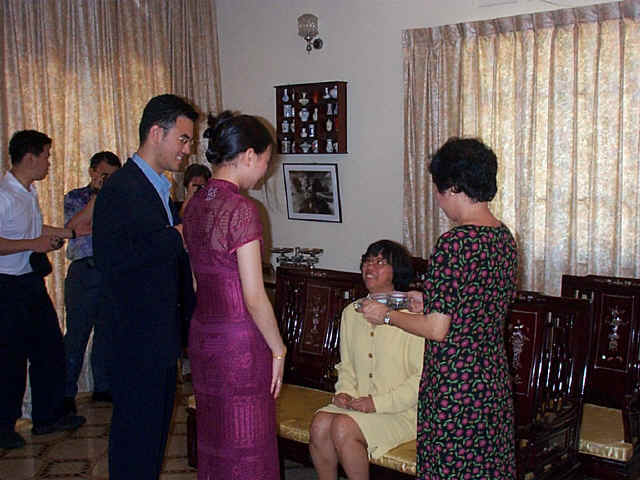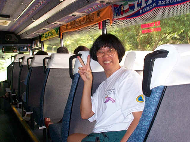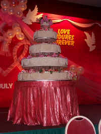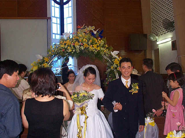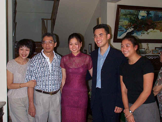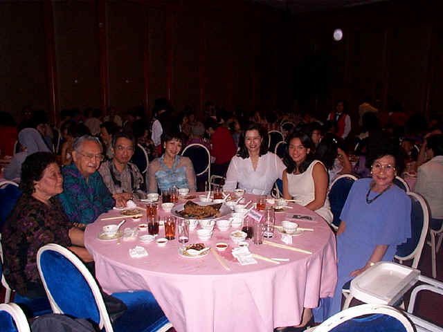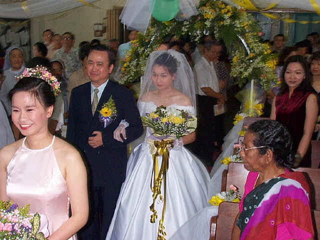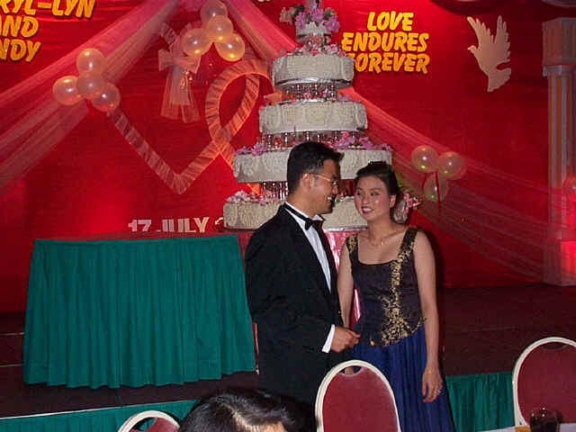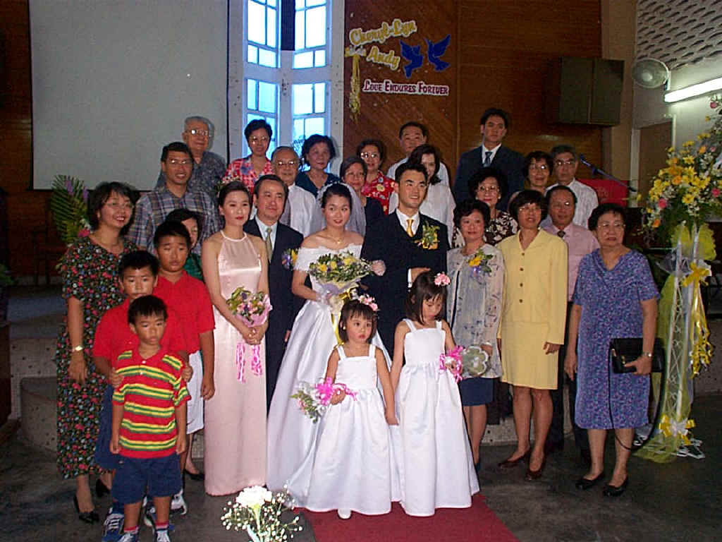 Cheryl-Lin and Andy's wedding was held on Saturday, 17 July 99, 3:00pm, in Kluang, Johore. A Singapore delegation of 23 people travelled by bus (wonderfully organised by Cheng) to Kluang and got to stay at the Prime City Hotel. After checking in, we proceeded to church (after getting lost for a while) and made it there just before the bride ! We hurried to our seats and were witness to a beautiful wedding where we saw the blushing bride being led by Kian Seng, and finally emerging with a handsome groom. The thanksgiving dinner was held later that day at 6.30pm in the very hotel we were staying in. The food was excellent, but the "entertainment" was better. Cheng was Master of Ceremonies (in her sexy sarong kebaya) and she made the night all the more memorable for the 440+ guests and the beaming couple with her constant "merapek"ing !! :-) The next morning, after a buffet breakfast complete with "Yew Char Kuay" (!), we went to Sylvia and Kian Seng's home for the tea ceremony. After we were introduced to Andrea's beau, and sipped some of the delicious tea, we were soon on our way back to Singapore. Our kids agreed with us, the trip was really fun, and we were very sad to have it end so soon. Perhaps there'll be another next year...? |