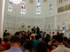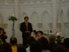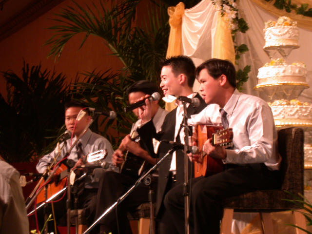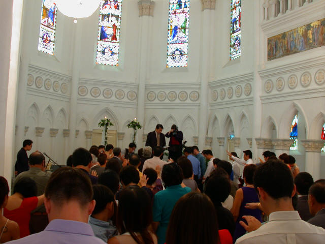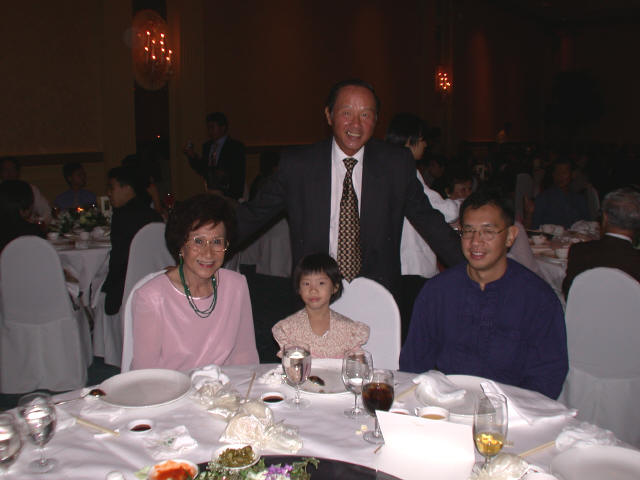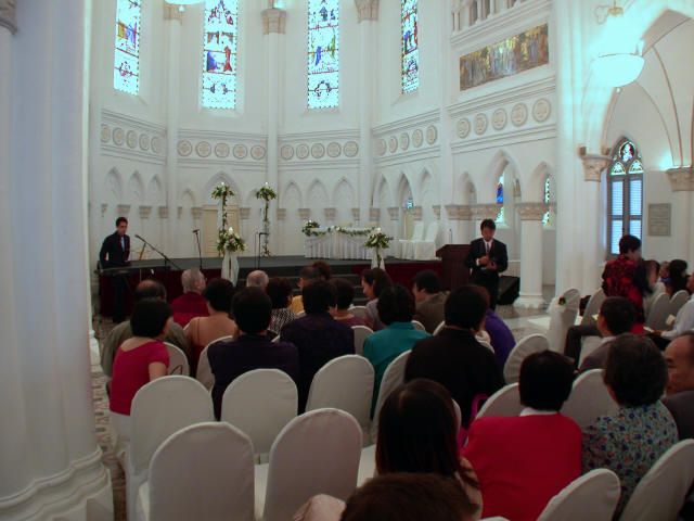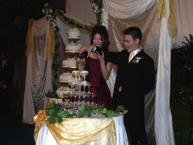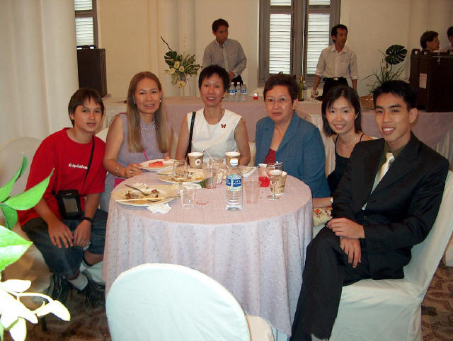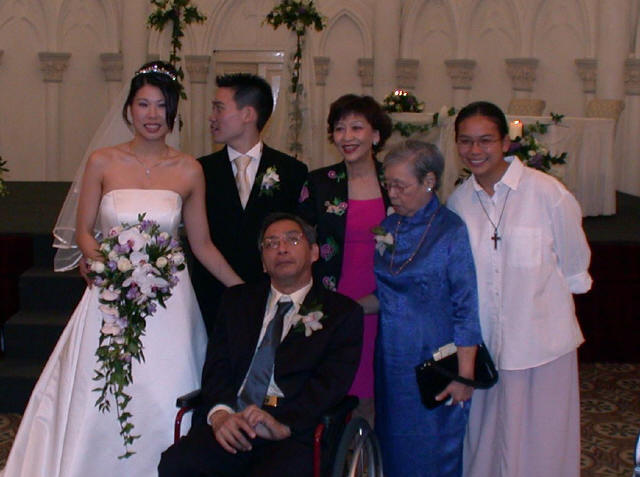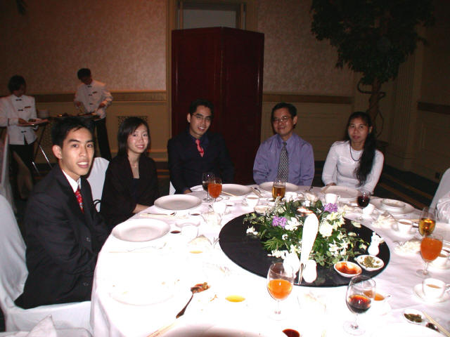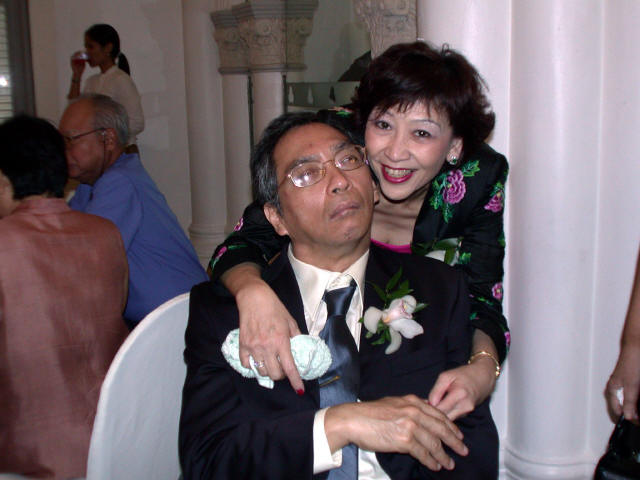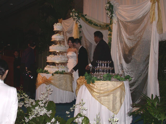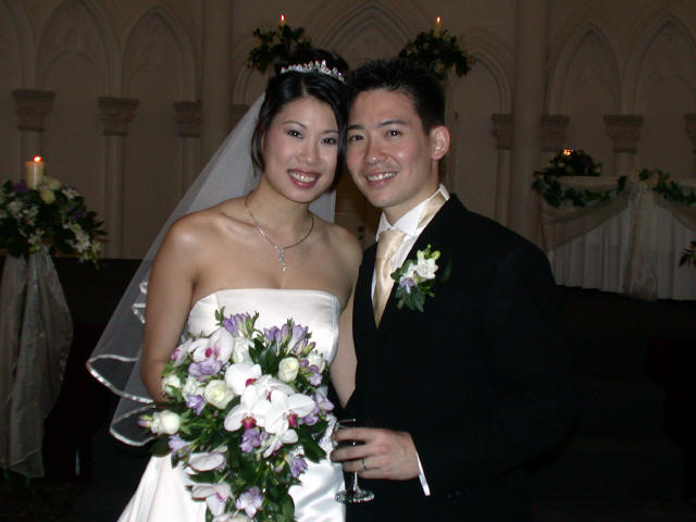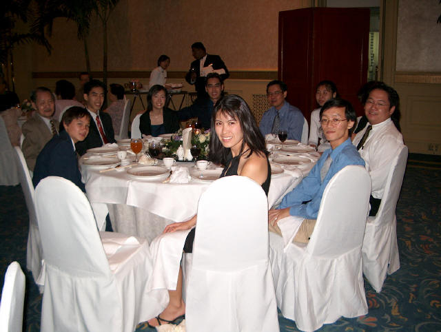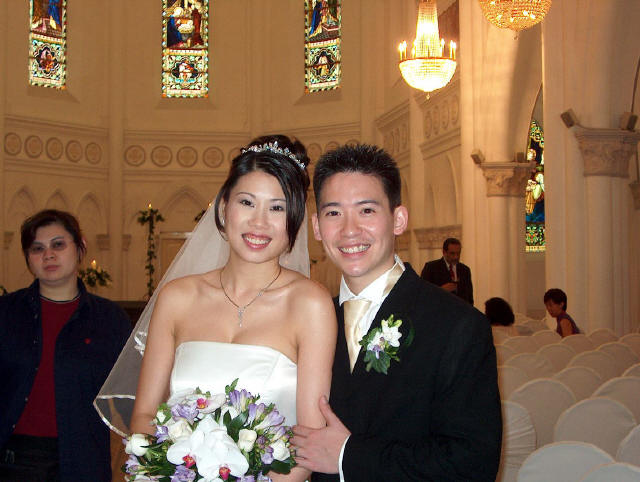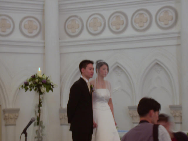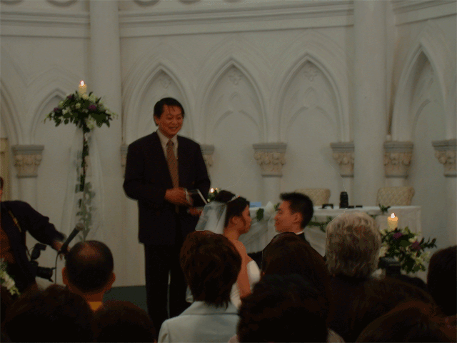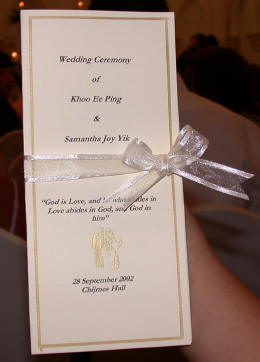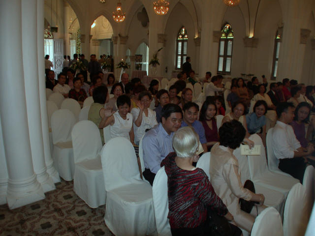 Links in this page : | Ee Ping and Samantha was wed at 10.30am on Saturday, 28 Sep 2002 at the Chijmes Hall, Victoria Street. It was a very beautiful wedding in a hall that was certainly fitting for the occasion. All the guests had arrived and seated and were waiting expectantly for the bride to arrive. Then finally, after a procession of bridesmaids so fair that we all thought each one of them in turn was the bride, Samantha appeared, clearly radiating with happiness, and outshining all her bridesmaids ! She joined Ee Ping at the altar, and in no time, the wedding vows were said and they were declared man and wife !! After that, there was a photo taking session and a very yummy reception. The wedding dinner was held at the Grand Ballroom at the Shangri-la Hotel that night. The pictures below captures some of the special moments, which included a very nice slide presentation on the couple, a very eloquent speech by Ping, and also Ping's serenade to Sam ! I'm sure we all wish the newlyweds a very blessed marriage ! P.S. Did you manage to find the animated kissy kissy picture by clicking on one of the images above ? :-)