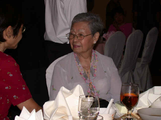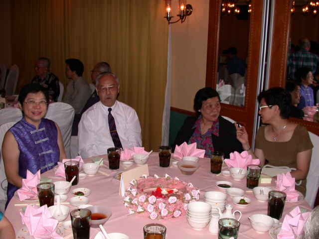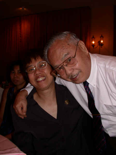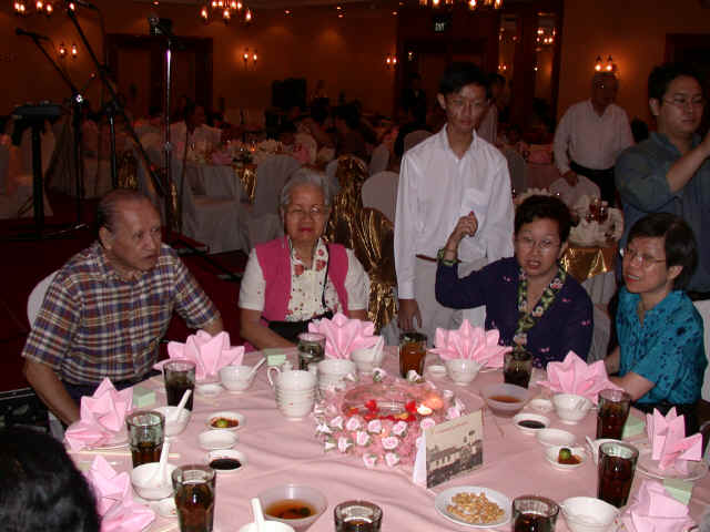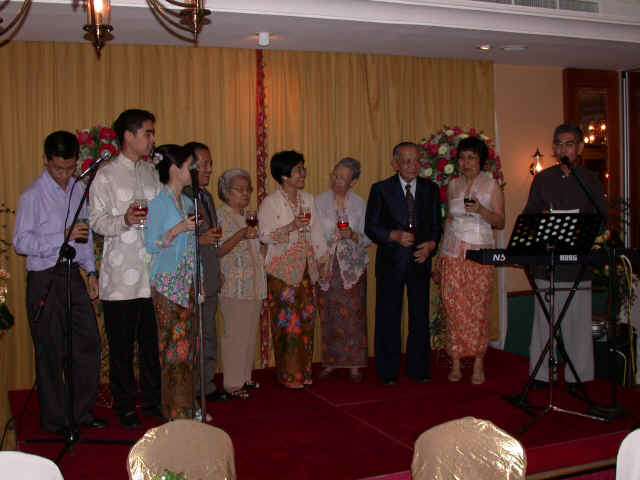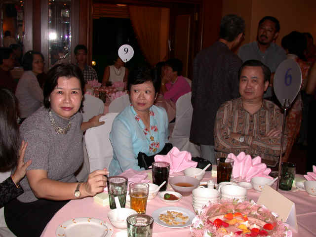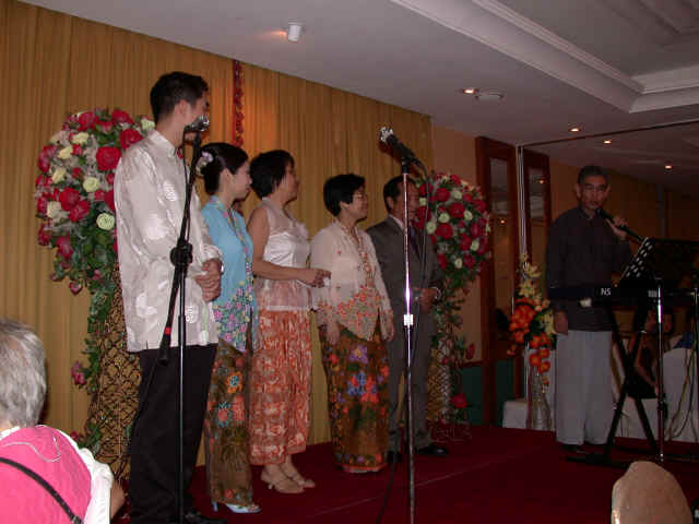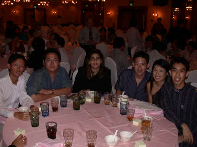 Links in this page : | Ee Wen and Joanna were married on 17 Nov 2001 at Paya Lebar Methodist Church It was a very beautiful wedding, one of the nicest I have ever been to. I really enjoyed the duet that Ee Wen had written, and both of them sang, as well as the other presentations they had. After the wedding, there was a very sumptious spread of food (even including bubble tea!) awaiting all of us at the foyer. Unfortunately though, my camera was spoilt so I couldn't take any pictures at the wedding. The dinner was held at the Punggol Marina on 18 Nov 2001, where Cheng was the MC. Ee Wen and Joanna performed again so that those who couldn't make the wedding ceremony could here the lovely song they sang before. Here are some of the studio pictures they had at the entrance. If you'd like to see the real thing...it's a lot better than my reproductions here... Some photos of the bride and groom with their families on stage. There were quite a few tables there, but I only managed to snap these... And finally, a "spot the celebrities" section. Alamak....see the DOM with Cheng !! Looks like all her advertising has at last been successful !! Haha...joke lah. Anything Goh Pek can do to get into the photo ! |