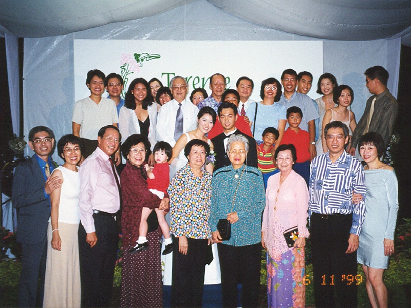 Links in this page : | Ming Fern and Terence's wedding was held on Friday, 11 Jun 99, 6.30pm, at Fort Gate on top of Fort Canning Park. It was one of the most romantic weddings I had ever attended, and it was very obvious that great pains had been taken to make sure that every single aspect of the occasion was special !! Though it was outdoors, God blessed the wedding with great weather. Ming Fern's arrival was spectacular - emerging from the mist-filled stone archway in a honking tooting love bug !! After the ceremony, we had the usual makan session followed by some songs from those gifted with great voices, and of course by a photo session where we got together once again.... Finally, a picture of the blushing bride and groom, with Ee Wen and Tuo Shen....wah....so radiant hor !! |