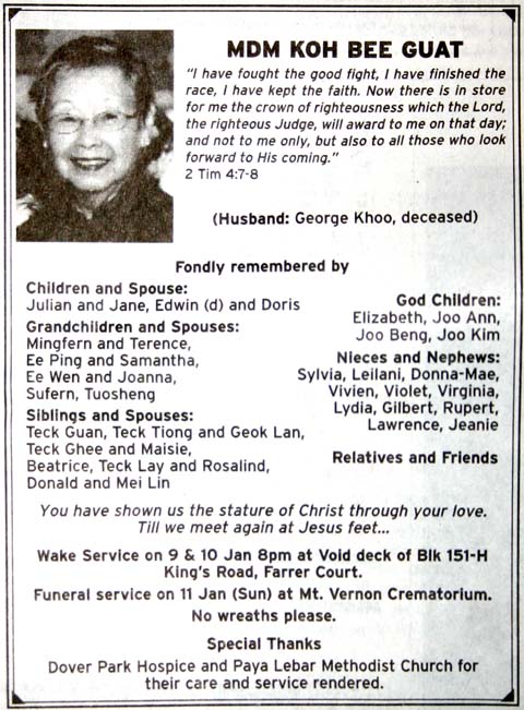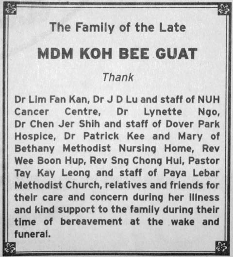 Sincere condolences to Joe and Jane, Doris, Ping and Sam, Su Fern, Ee Wen and Joanna, Ming Fern and Terence, and Tuo Shen.