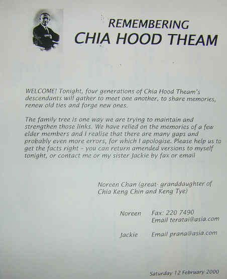 Links in this page : | REMEMBERING WELCOME! Tonight, four generations of Chia Hood Theam's descendants will gather to meet one another, to share memories, renew old ties and forge new ones. The family tree is one way we are trying to maintain and strengthen those links. We have relied on the memories of a few elder members and I realise that there are many gaps and probably even more errors, for which I apologise. Please help us get the facts right - you can return amended versions to myself tonight, or contact me or my sister Jackie by fax or email.